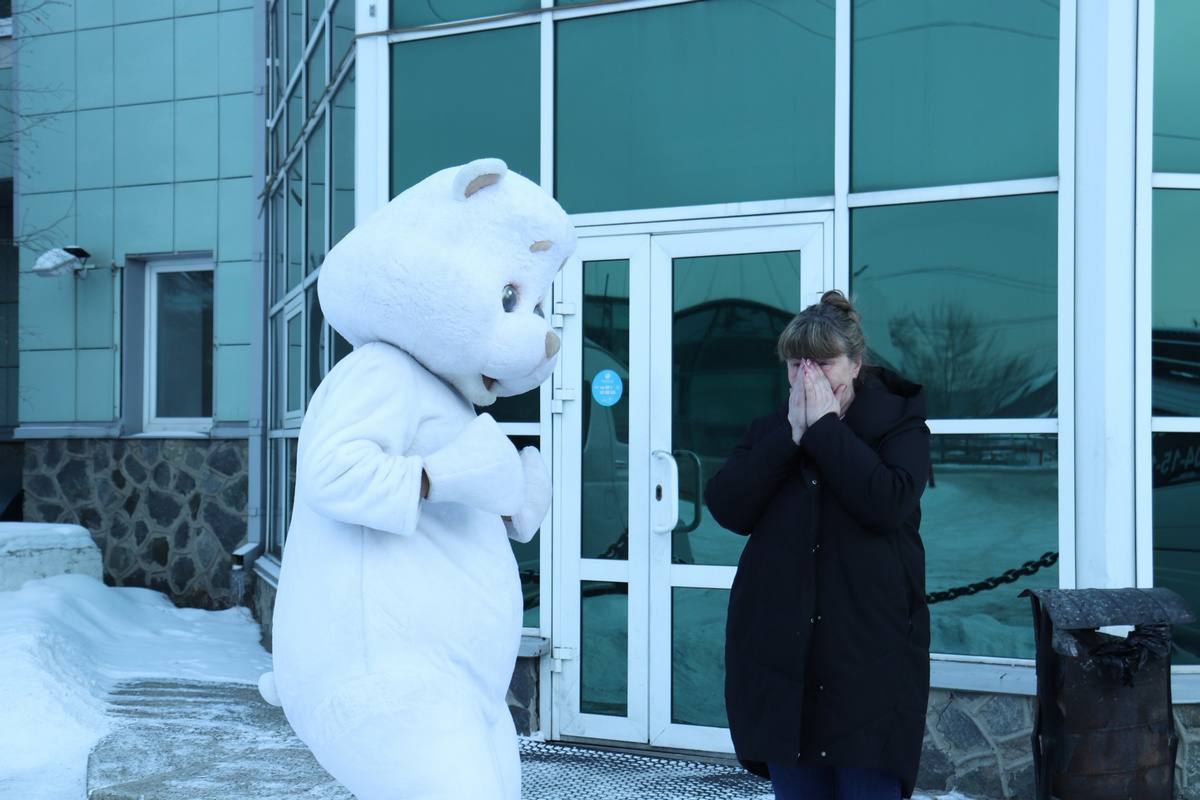 Ребята организовали трогательную встречу сына и мамы, а ростовая кукла Мишка помогла поднять настроение всем участникам встречи.