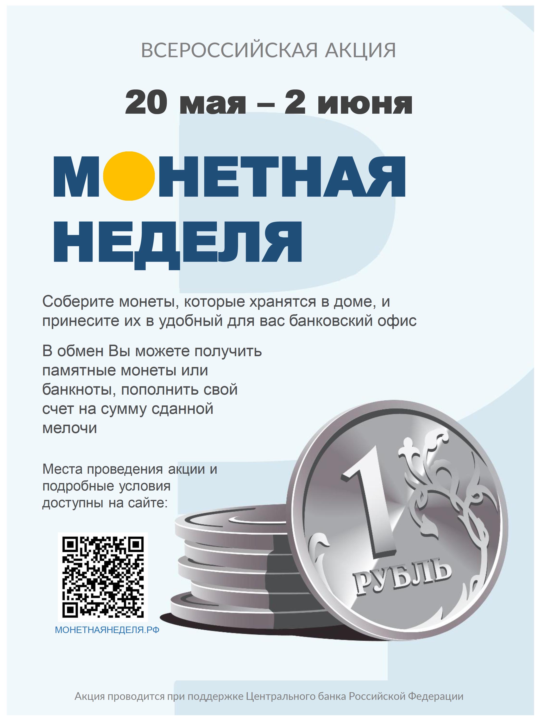 Всероссийская акция «Монетная неделя» проводится уже второй раз под эгидой Банка России совместно с коммерческими банками. Её цель – вернуть в оборот монеты с выгодой для каждой семьи – т.е. без оплаты комиссии за размен.