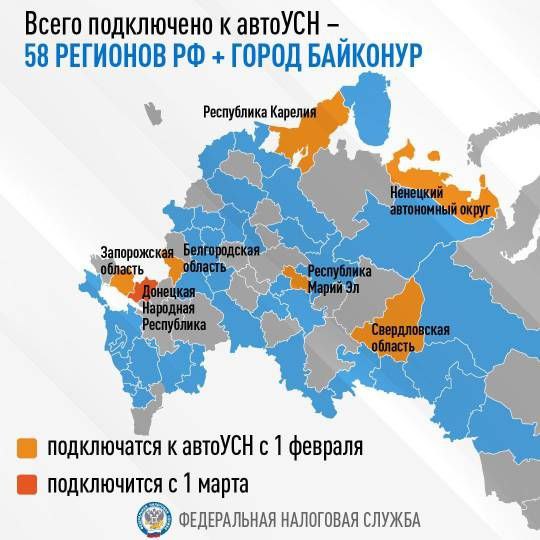С 1 февраля автоУСН станет доступен ещё в шести регионах: республика Карелия, республика Марий Эл, Белгородская и Свердловская области, Ненецкий автономный округ, Запорожская область, с 1 марта - в Донецкой Народной Республике.