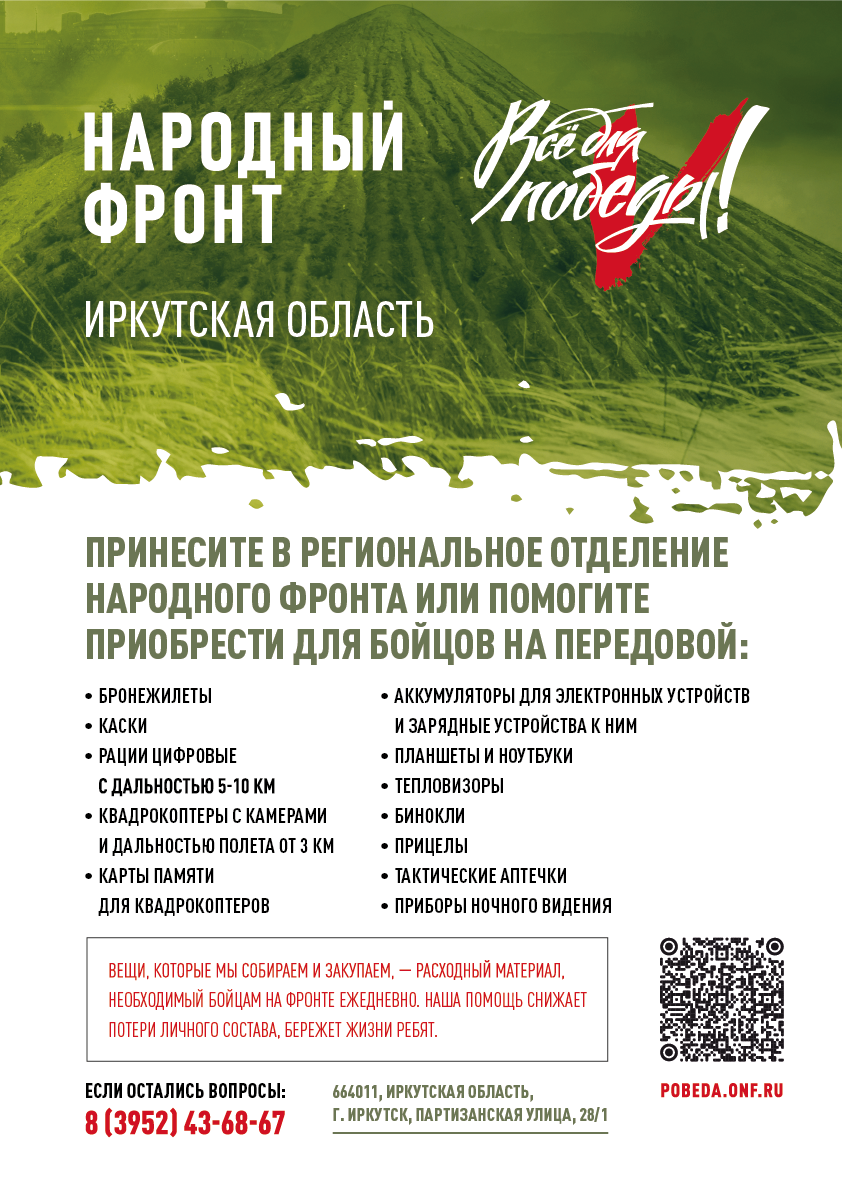 Просим Вас оказать адресную помощь военнослужащим из Иркутской области. Перевод денежных средств от юридического лица можно сделать по реквизитам Благотворительного фонда «Всё для Победы!», указав в назначении платежа «sbor.38». Денежный перевод на любую сумму, физические лица могут сделать, используя региональный QR-код, или на сайте pobeda.onf.ru, выбрав региональный сбор - Иркутская область.