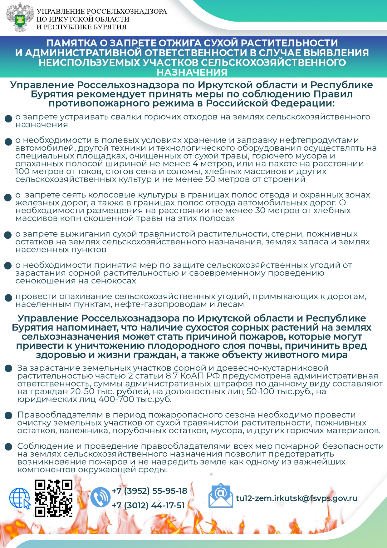 УПРАВЛЕНИЕ РОССЕЛЬХОЗНАДЗОРА ПО ИРКУТСКОЙ ОБЛАСТИ И РЕСПУБЛИКЕ БУРЯТИЯ предлагает ознакомиться с Памяткой о запрете отжига сухой растительности и административной ответственности в случае выявления неиспользуемых участко