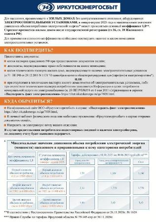 Дополнительно с 1 января 12025 года в области введен понижающий коэффициент к тарифам на электроэнергию для домов с электроотоплением.